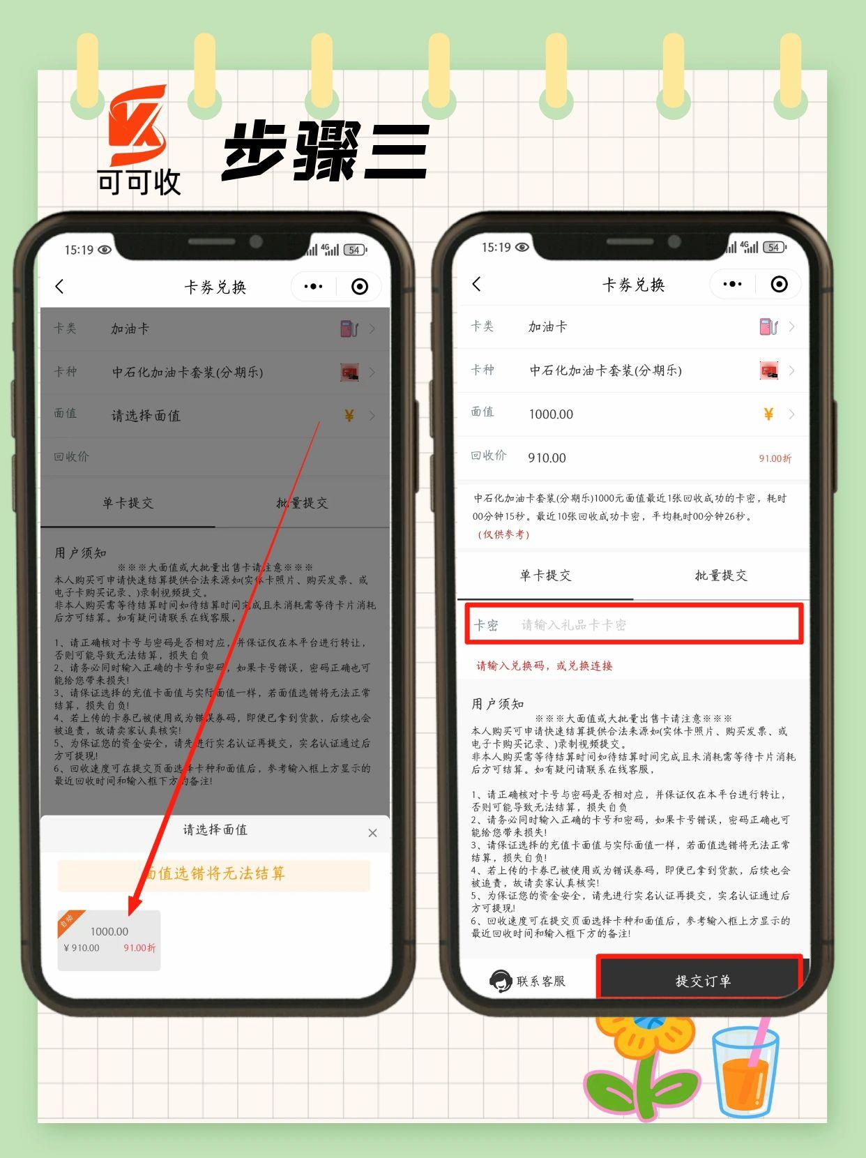 3:选择面值,填写卡密,提交订单,耐心等待审核通过即可